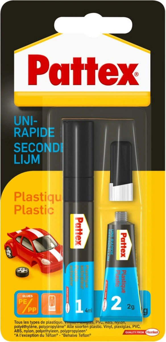 Pattex Secondelijm Plastics – voor supersnelle en supersterke verlijmingen van alle kunststoffen! Deze plasticlijm heeft een tweedelig systeem inclusief Primer. Door gebruik van de primer kunt u werkelijk alle soorten plastic verlijmen. Dit is uniek ten opzichte van elke reguliere lijm.