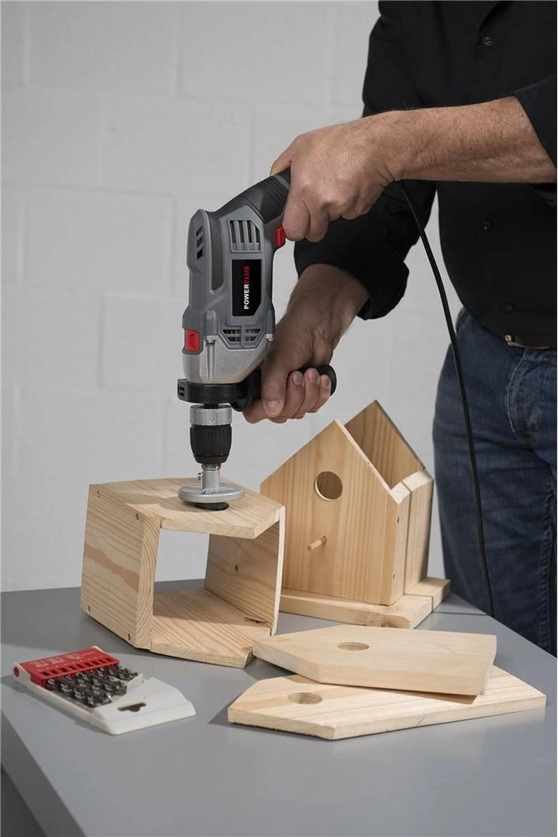De 950 klopboormachine heeft een klopfunctie waarmee je dus niet alleen vlotjes door hout (tot 40 mm) en staal (tot 8 mm) boort, maar ook moeiteloos tot 50 mm in beton boort. De hulphandgreep geeft je daarbij de steun die je zoekt, je blijft volledig controle behouden over het boorwerk. Afhankelijk van de schroef- of boorklus, pas je ook heel makkelijk het toerental van de POWE10035 aan. De dieptestop voorkomt dat je geen millimeter te diep boort.