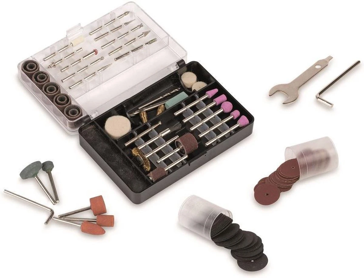 Met deze roterende multitool haal je een uiterst veelzijdig toestel in huis. Afhankelijk van het opzetstuk dat je kiest, kan je zowel boren, frezen, graveren, polijsten, slijpen en schuren. Met de 126 bijgeleverde accessoires (slijpsteentjes, graveerpunten, schuurwiel, schuursteen, polijstviltjes, doorslijpschijfje & vlakschuurschijfje) vind je sowieso wat je zoekt voor de meest uiteenlopende klussen. Je wisselt de accessoires snel met de asvergrendelingsknop.