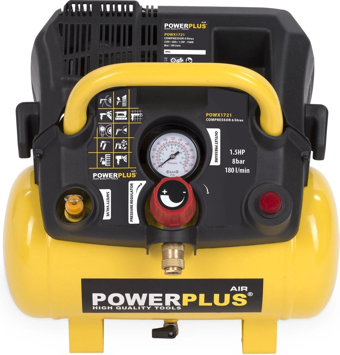 Deze draagbare, olievrije compressor is erg compact en licht. Hij heeft een kleine tank van 6 liter en weegt minder dan 10 kilo. Dit maakt hem gemakkelijk te verplaatsen naar daar waar je hem nodig hebt.