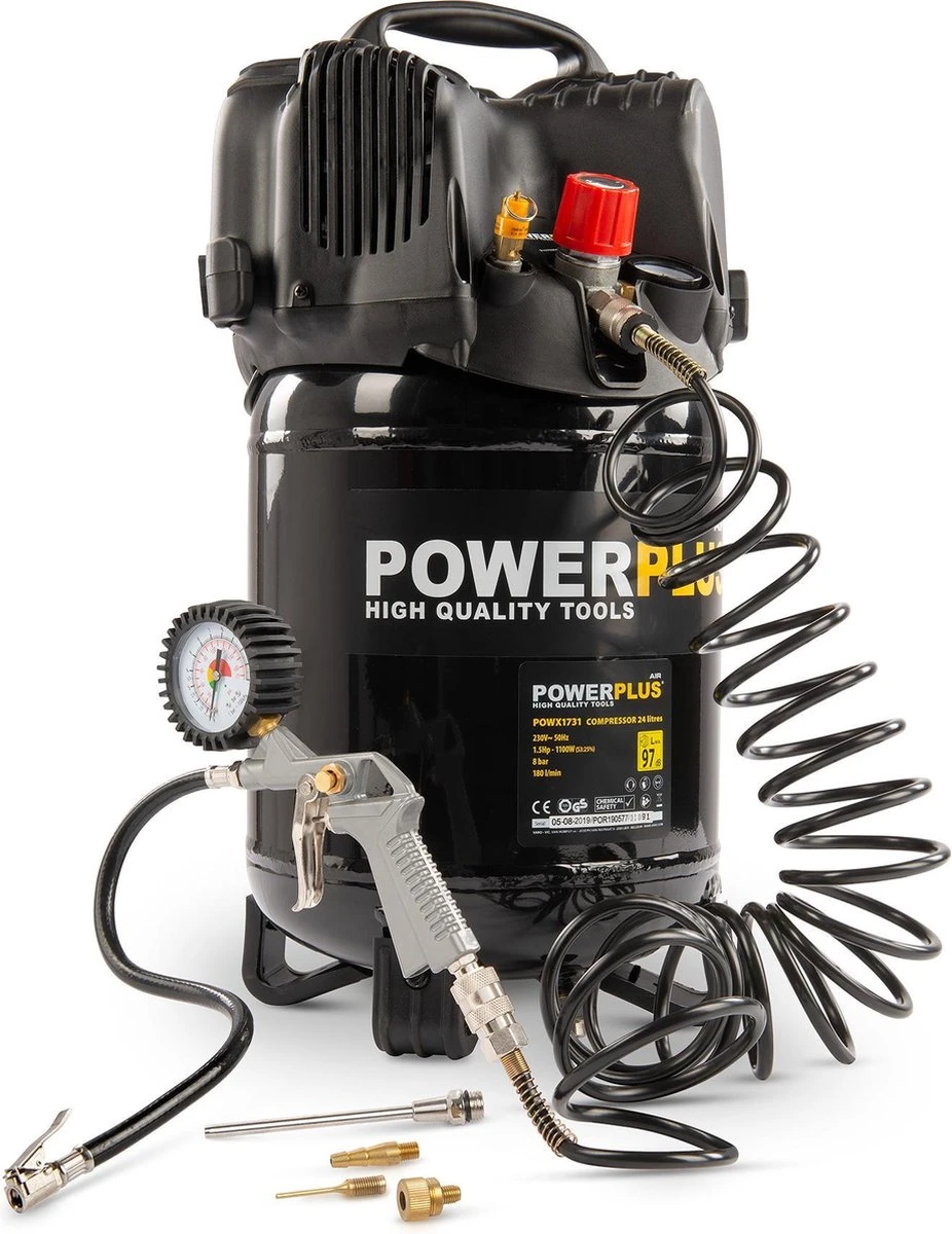 Deze verticale Powerplus compressor met een tankinhoud van 24l heeft een vermogen van 1100W. De werkdruk van deze olievrije machine bedraagt 8 bar.