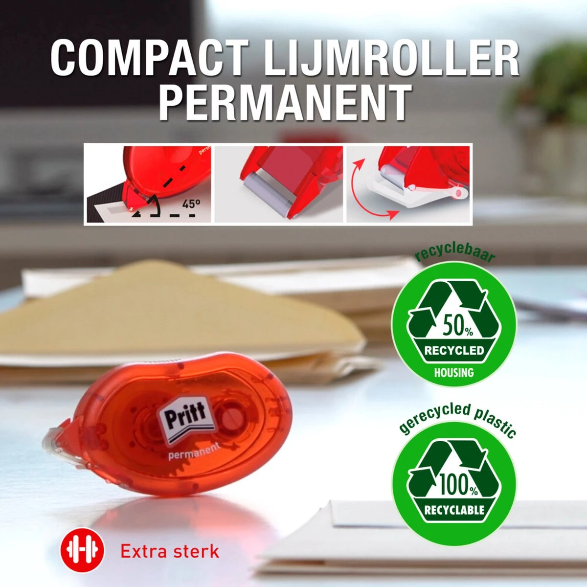Productvoordelen in een oogopslag:- Compacte lijmroller- Licht en handzaam ontwerp- Geschikt voor papier, karton, glas, foto’s en synthetische materialen- Permanente, onmiddellijke verbindingen- Schone, nauwkeurige applicatie- 100% recyclebaar- Formaat: 2x10mx8,4mm