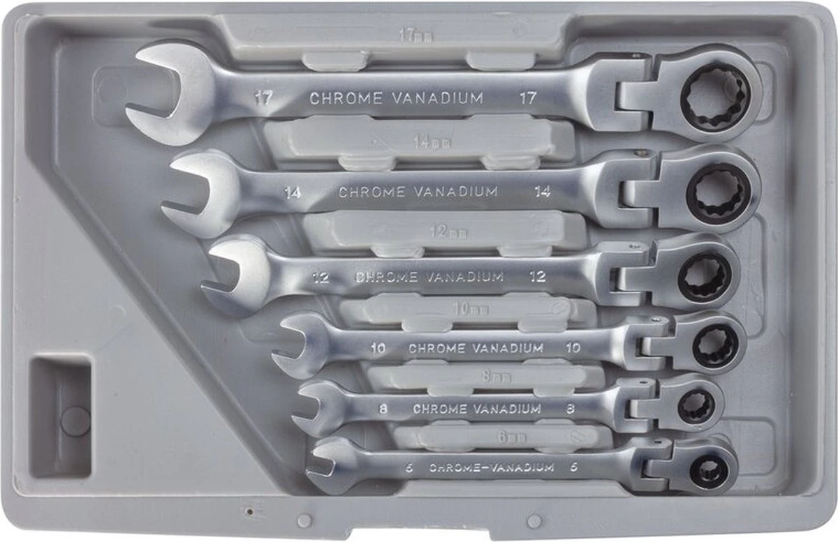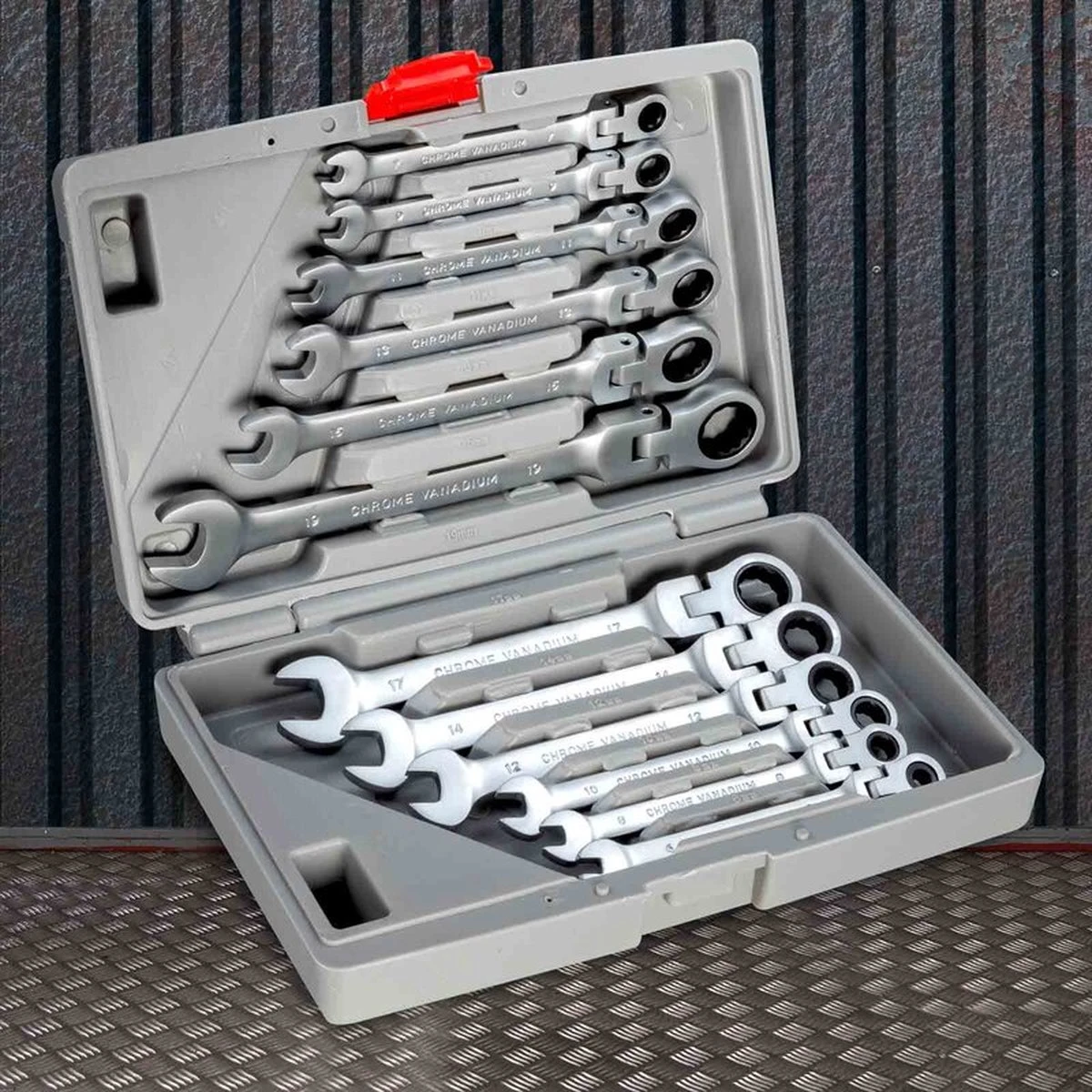 Met deze steeksleutel set kunt u erg makkelijk onder een hoek monteren, handig wanneer u ergens lastig bij kunt. De ringsleutel kop van deze steeksleutel is flexibel, dus draaibaar naar verschillende hoeken. De flexibele ratelkop is verstelbaar tot wel 180 graden. Zo kunt u zelfs op kleine afgeschermde plekken sleutelen. Doordat de ratelsleutel voorzien is van 72 tanden, kan deze al functioneren met een rotatie van 5 graden.