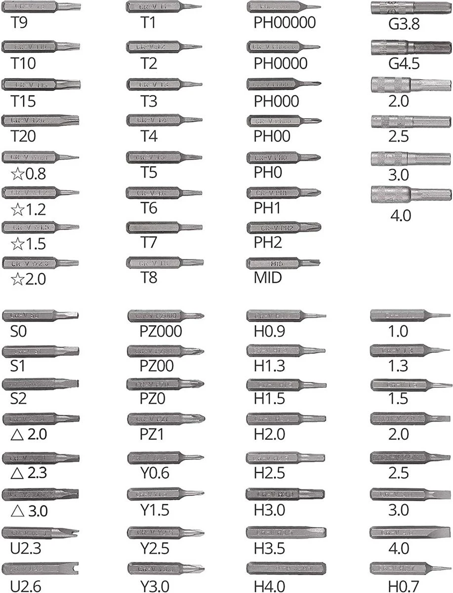 • Torx (T2, T3, T4, TR5, TR6, TR8, TR10, TR15 )
