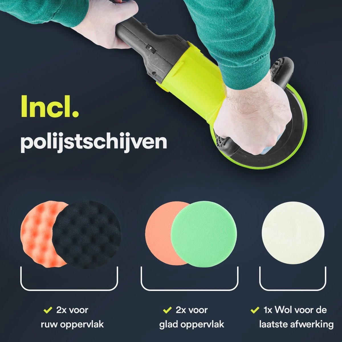 De polijstmachine van Qumax is voorzien van een draaischijf van 180 mm, waar polijstschijven op bevestigd kunnen worden. Bij de polijstmachine ontvang je vier van dat soort foam polijstschijven. Hiervan zijn er twee geschikt voor gladde oppervlakken en twee voor iets ruwere of versleten oppervlakken, die een wat hardere aanpak vereisen.