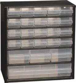 Stevige metalen ladekast van Raaco met 24 slagvaste polypropyleen laden. De lades kun je verdelen met los te verkrijgen tussenschotjes (10 tussenschotjes worden standaard meegeleverd). De ladebakjes zijn transparant zodat je in een oogopslag ziet wat er in zit. De ladekast is geschikt voor muurbevestiging en is eenvoudig te monteren aan de wand. Ideaal voor in de werkplaats of hobbyruimte voor het opbergen van kleinere materialen zoals schroeven, pluggen en spijkers.