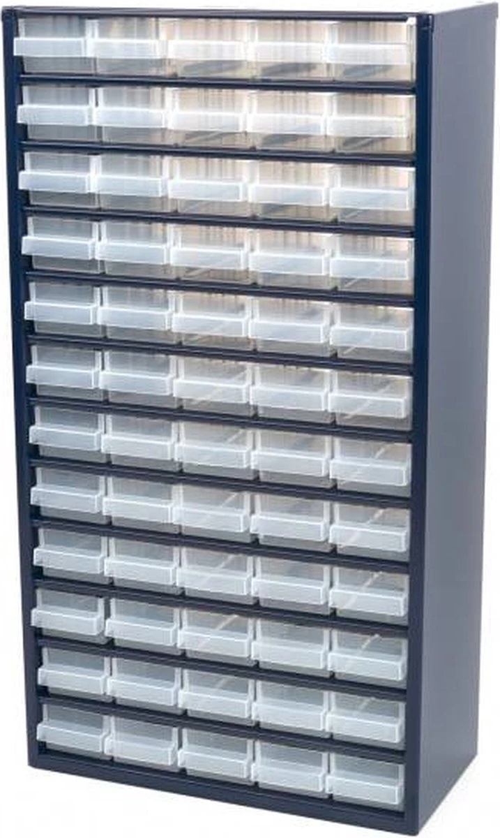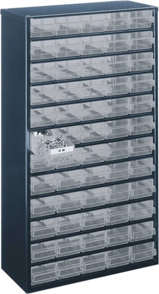 Stevige metalen ladekast van Raaco met 60 polypropyleen laden. Er worden 10 tussenschotten meegeleverd zodat je enkele laatjes naar wens kunt indelen. De lades kun je in maximaal 4 vakken verdelen. De ladebakjes zijn transparant zodat je in een oogopslag ziet wat er in zit. De ladekast is geschikt voor muurbevestiging en is eenvoudig te monteren aan de wand. Ideaal voor in de werkplaats of hobbyruimte voor het opbergen van kleinere materialen zoals schroeven, pluggen en spijkers.