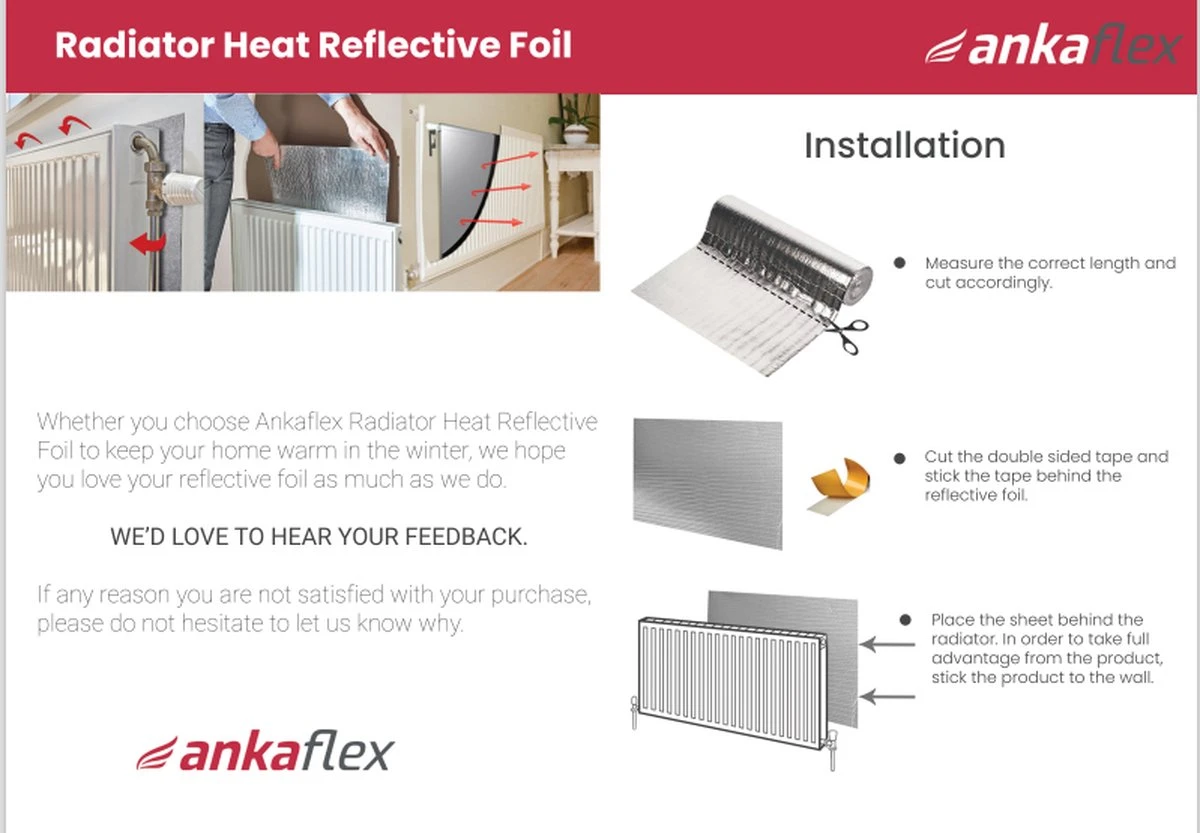 - Verwarmingskosten slim verlagen – Slecht geïsoleerde wanden zijn vaak de reden voor te hoge verwarmingskosten. De radiatoren zorgen voor reflectiefolie, waarvan de warmtereflectie van de aluminiumlaag een verkorte opwarmtijd en een langere temperatuur heeft.