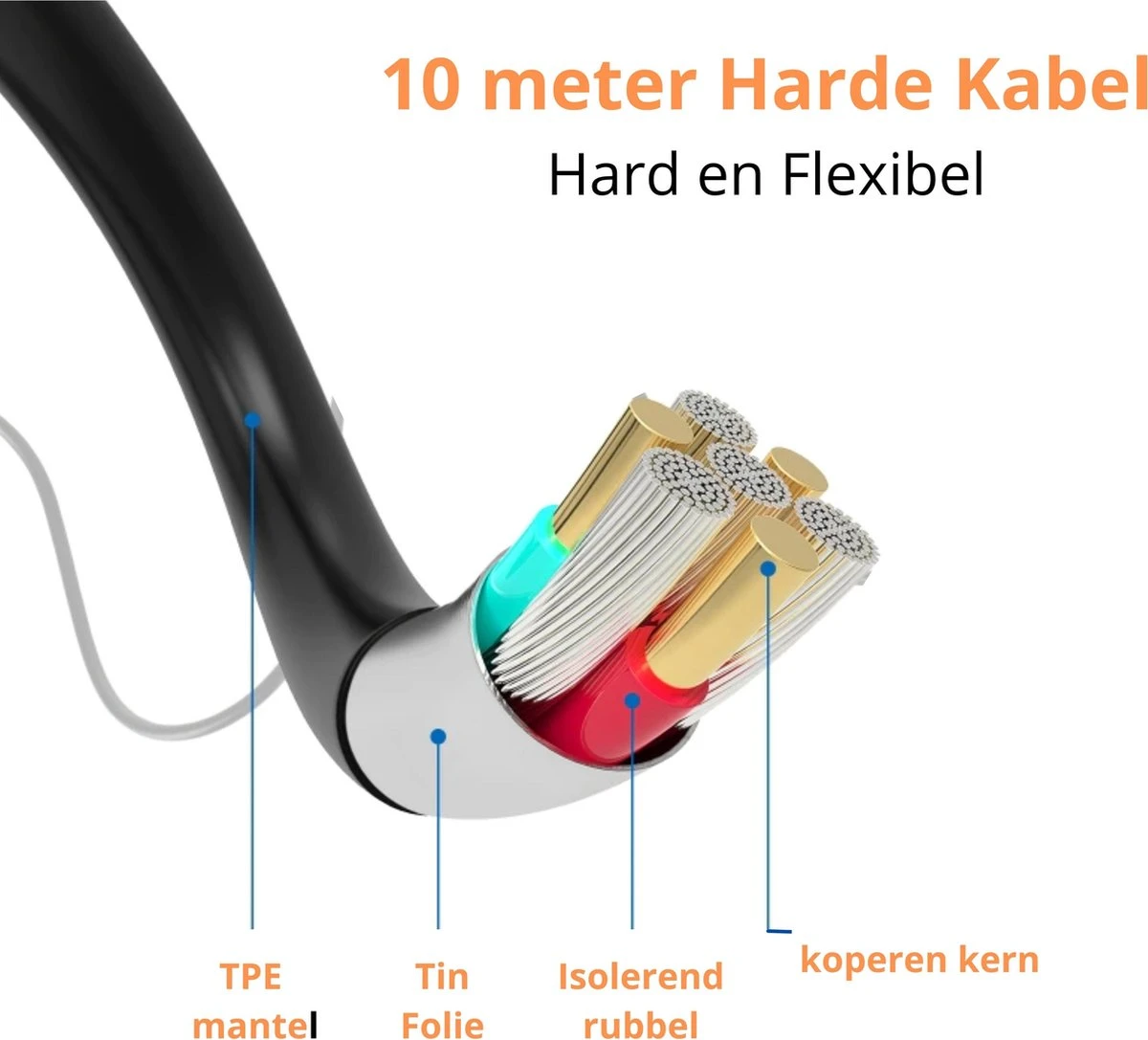 Tijdens de inspectie wil je natuurlijk niet dat de kabel breekt of beschadigd, hierom is het lensdraad opgebouwd uit verschillende materialen. De kern is van vertind koper, hierop volgend een laag isolerend rubber gevolgd door zilverfolie en als laatste een TPE afdekking. Hiermee verzekeren wij jou van een sterke en stevige kabel die tegelijkertijd flexibel genoeg is om op lastige plekken te kunnen komen.