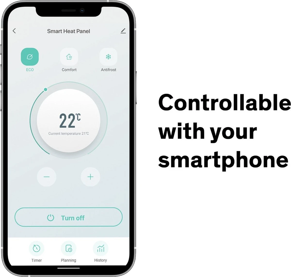 Hou altijd uw slaapkamer, woonkamer of buitentoilet op de gewenste temperatuur met de Smart Panel Heater! Laat hem bijvoorbeeld beginnen met verwarmen voor u wakker bent, of stoppen met verwarmen als de zon onder gaat. Maak het verwarmen net zo slim als u wilt met zelf geprogrammeerde schema’s.
