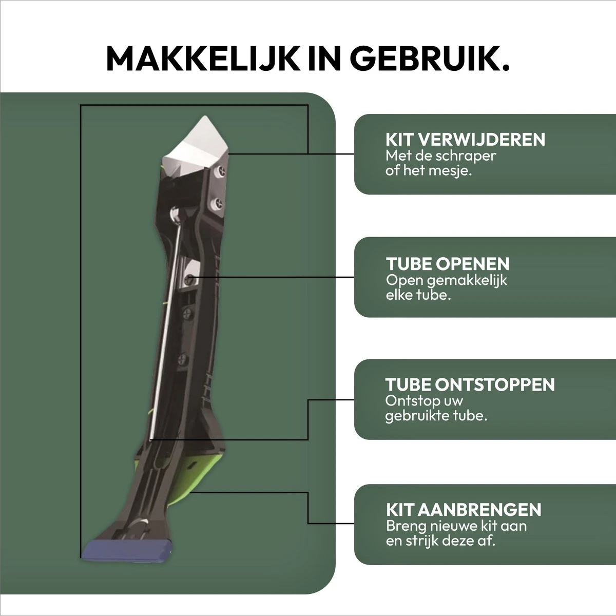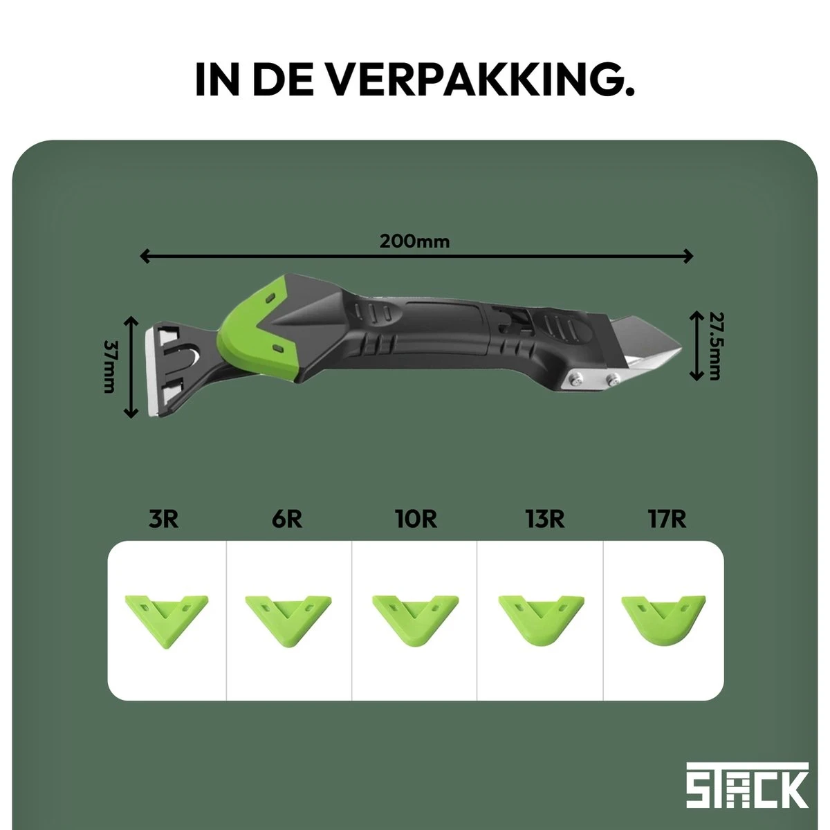 Vieze kitranden zijn verleden tijd met de 5 in 1 Kit Schraper van STACK. Met deze tool verwijder je oude kitranden en werk je nieuwe kitranden in een handomdraai netjes af!