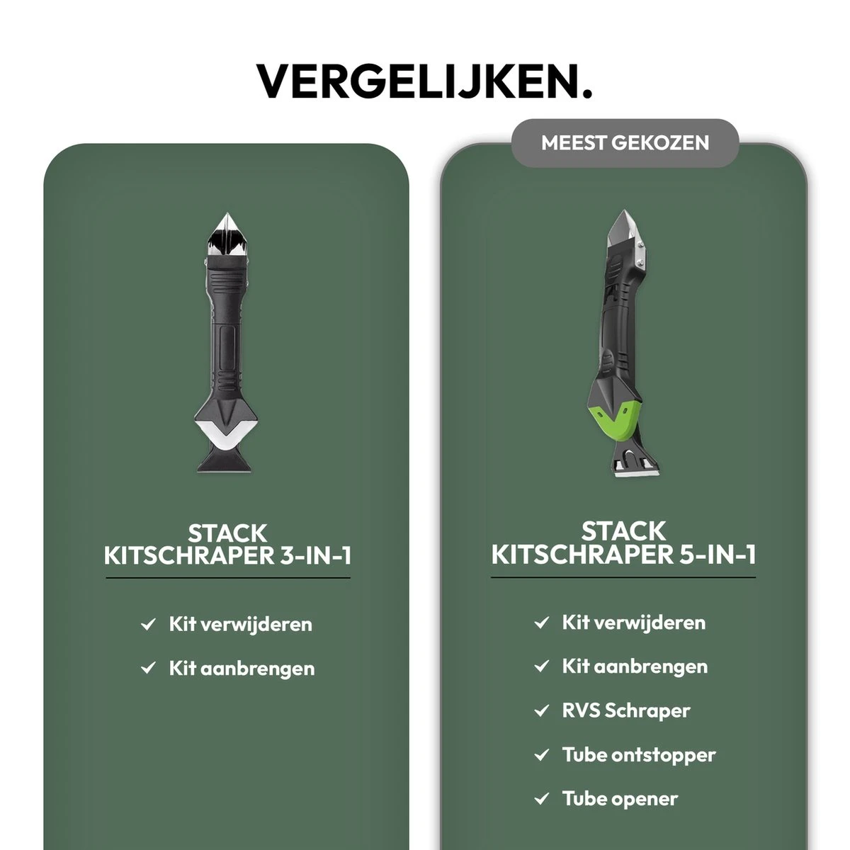 Elke doe-het-zelver of beroepsklusser komt ze wel eens tegen; smerige of versleten kitranden. Waar vieze kitranden uiteraard een onsmakelijk gezicht zijn, kunnen deze ook voor lekkages zorgen. Met de STACK Kit Schraper verwijder je in een handomdraai de oude kitranden doormiddel van de RVS schraper en het RVS mesje. De nieuwe kitranden werk je gemakkelijk, en in iedere gewenste vorm, af met de 5 bijgeleverde afstrijkrubbers. Zonder vieze vingers!