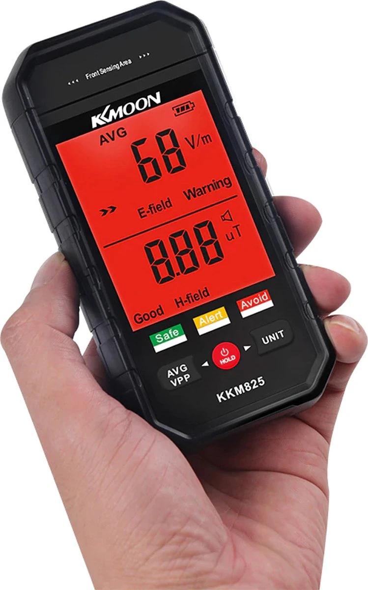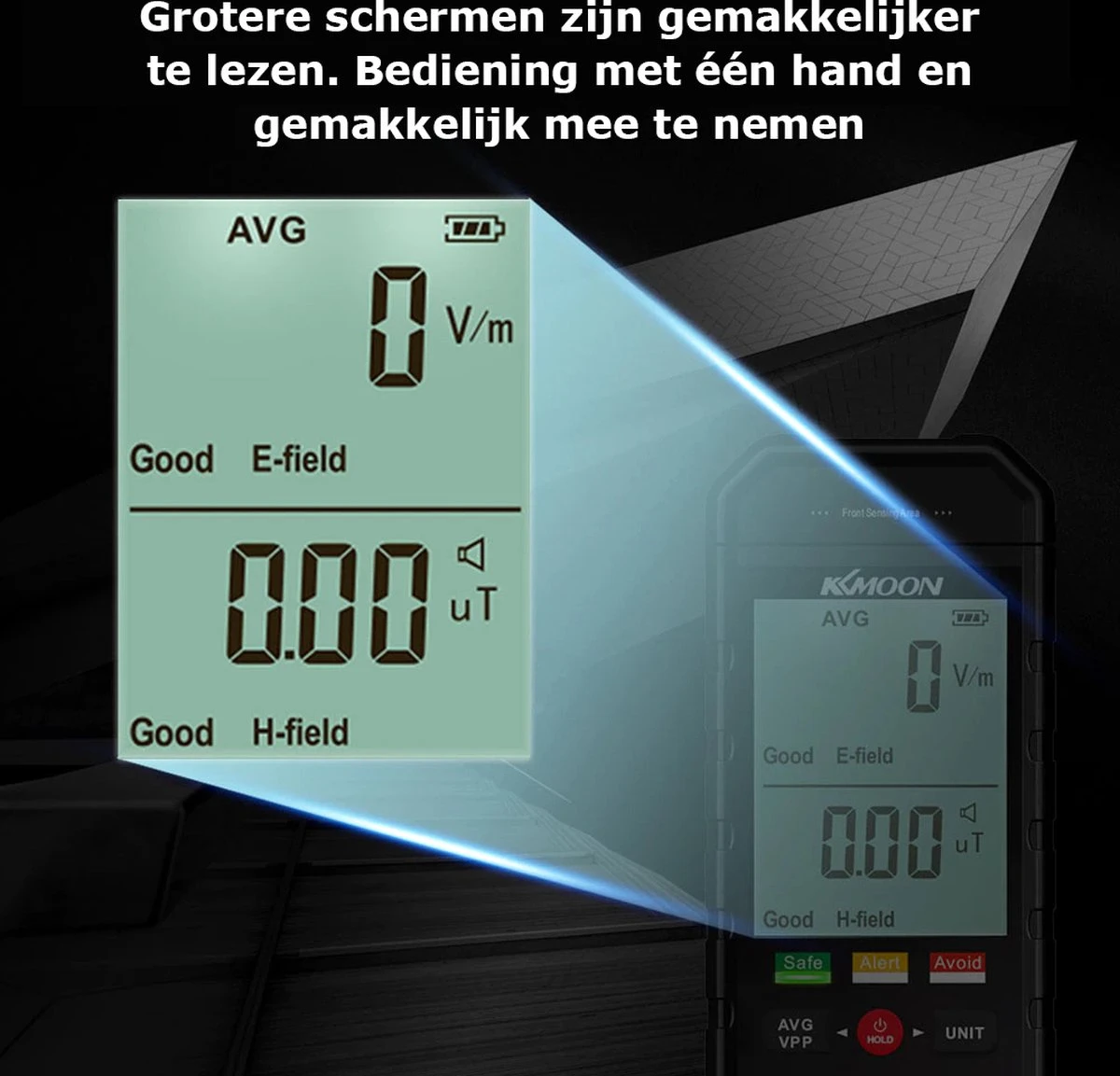 Max elektrisch veld van 1000 V/m en max magnetisch veld van 0,1 uT/mG, het meetbereik is breed genoeg voor dagelijkse detectie.