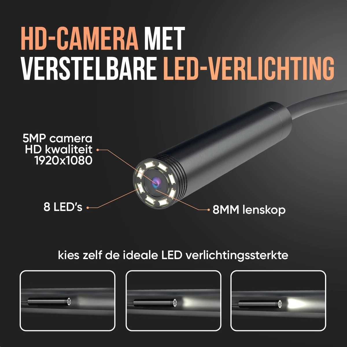 Met een cameralens van 8mm en ingebouwde ledverlichting die je naar eigen wens in felheid kan verstellen zal niets jouw oog nog ontsnappen. Zo kan deze praktische endoscoop camera in elke situatie worden gebruik, hoe smal of donker de ruimte dan ook is.
