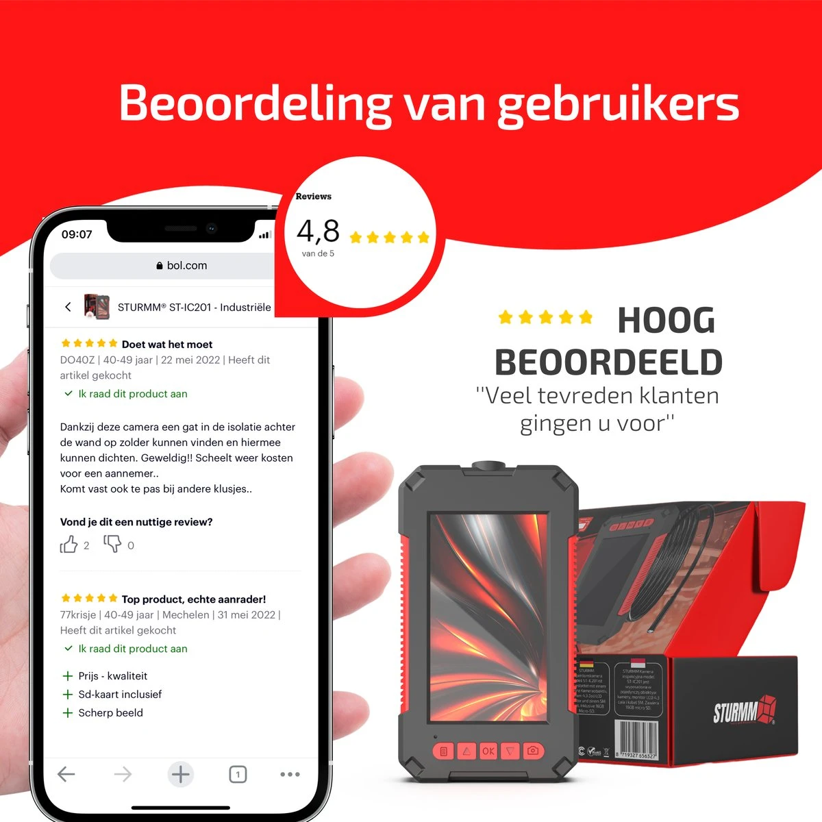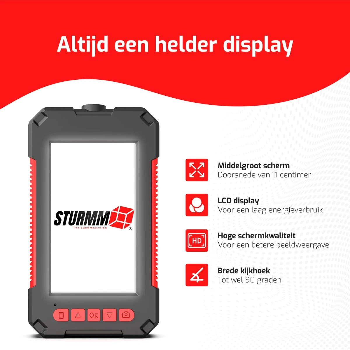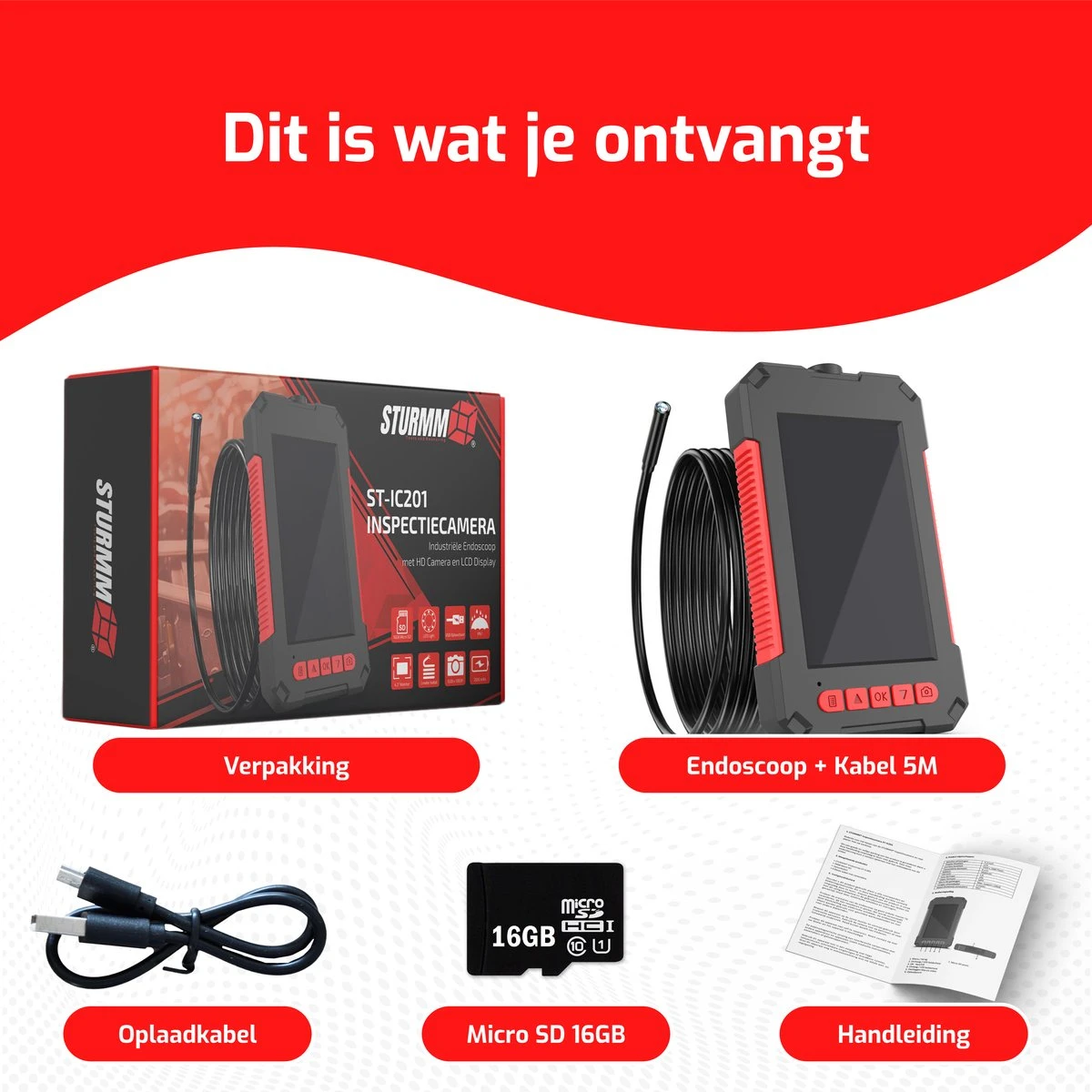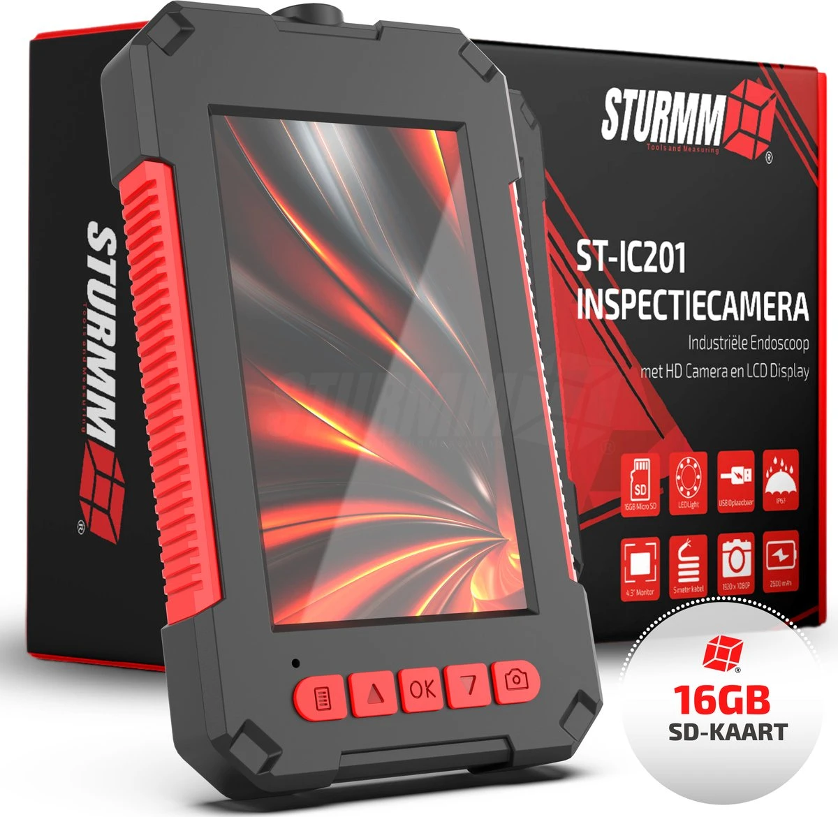 Ontdek het endoscoop assortiment van STURMM® en inspecteer moeilijk bereikbare plekken met één van onze hoog beoordeelde inspectiecamera’s. Model ST-IC201 is een multifunctionele endoscoop en geschikt voor een divers aantal inspectieklussen. Deze inspectiecamera is uitgerust met een hoogwaardige videokabel van 5 meter, HD camera en 4.3 Inch display. De endoscoop wordt geleverd met een gratis 16GB SD kaart voor het vastleggen van al uw beeldmateriaal.