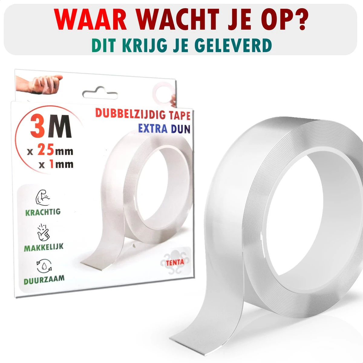 TENTA® Tape is Transparant, Herbruikbaar, Waterproof, Rekbaar, Super sterk en laat geen sporen achter. Met deze dubbelzijdige tape maak je gebruik van nano (suction) technologie. De werking is vergelijkbaar met de zuignappen van een octopus.
