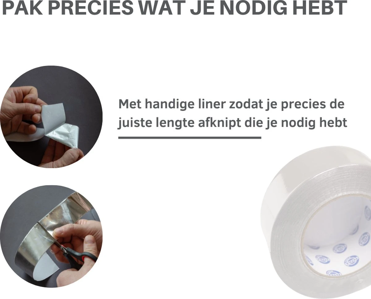 - Aluminiumtape met liner wat ervoor zorgt dat je precies kan pakken wat je nodig hebt