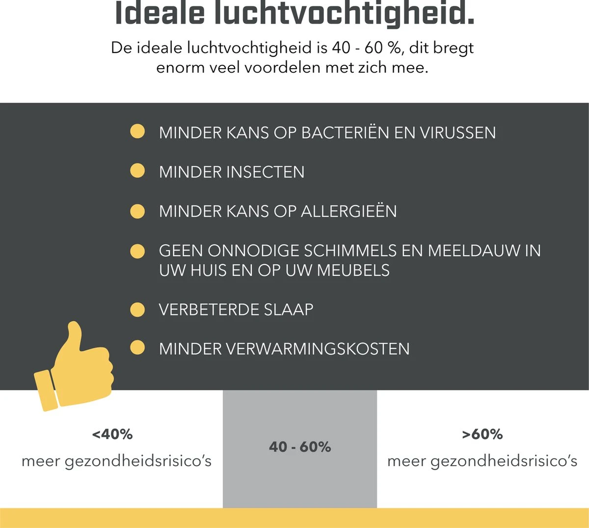 Een te hoge luchtvochtigheid kan overigens lijden tot warmteklachten, een toename aan bacterien, schimmels in huis en nog een tal van andere complicaties. Je binnenklimaat is dus belangrijker dan je denkt.