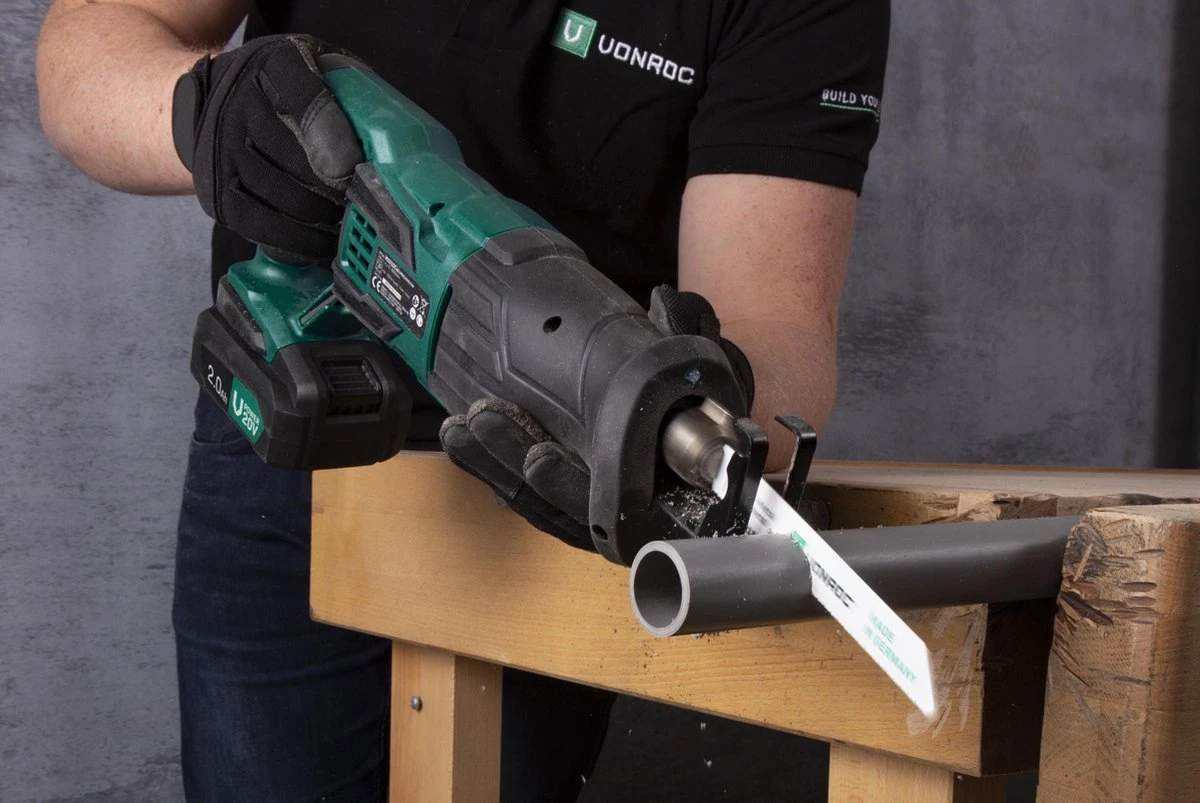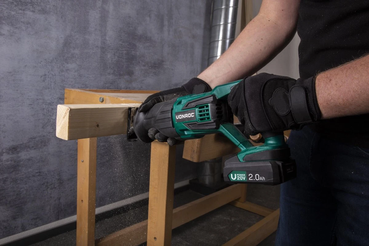 Deze complete set bevat een accu reciprozaag, een 20V 2.0Ah VPower accu, een sneloplader, 1 zaagblad voor (nat) hout, 1 universeel zaagblad voor zowel hout als metaal, 1 zaagblad voor metaal en een handige opbergtas. De 20V accu reciprozaag is onderdeel uit het VONROC VPower 20V accuplatform.