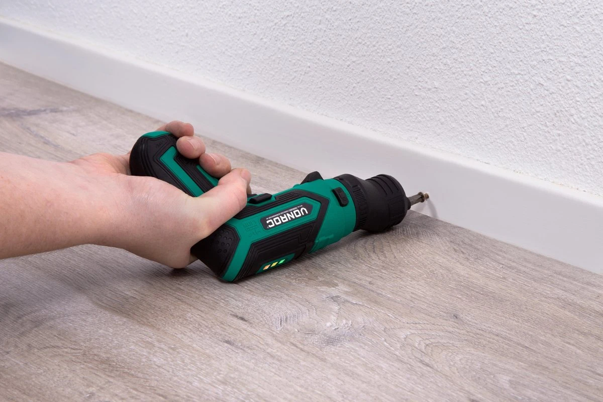 Gebruik dan deze lichte en compacte schroefmachine van VONROC. Met de meegeleverde haakse en excentrische opzetstukken kun je met gemak dicht bij randen en op andere lastig te bereiken plekken schroeven. Verwissel de opzetstukken gemakkelijk en snel met slechts één druk op de knop. Dankzij de dubbele LED-werklamp is de schroevendraaier ook op donkere werkplekken in te zetten.