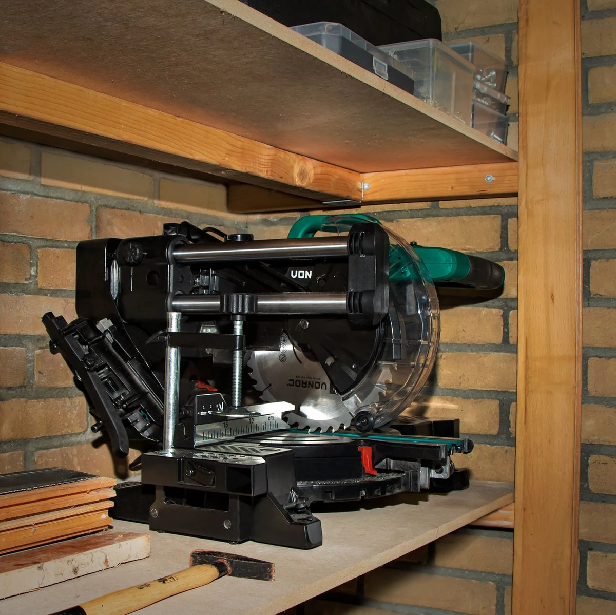 - Door de verstekarm op te bergen in de houder, de machine in transportstand te plaatsen en de tafelextensies in te schuiven, houd je een zéér compact geheel over dat eenvoudig op te bergen is. Andere types afkortzagen nemen altijd veel ruimte in beslag, deze kun je eenvoudig in een kast opbergen.