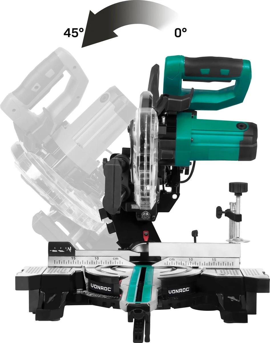 Deze 2200W schuif-verstekzaag van VONROC heeft een compact schuifsysteem dat vrije ruimte achter de machine overbodig maakt. Dit betekent dat de afkortzaag kan worden gebruikt in compacte/kleine werkruimtes en zelfs dicht bij een muur kan worden ingezet. De afkortzaag met trekfunctie beschikt over héél veel POWER, dankzij het hoge vermogen van maximaal 2200W en een hoog onbelast toerental van maar liefst 5200 omwentelingen per minuut. Na levering kun jij ook nog eens direct aan de slag. De afkortzaag wordt namelijk geleverd inclusief een Ø216mm, 40 tands zaagblad.