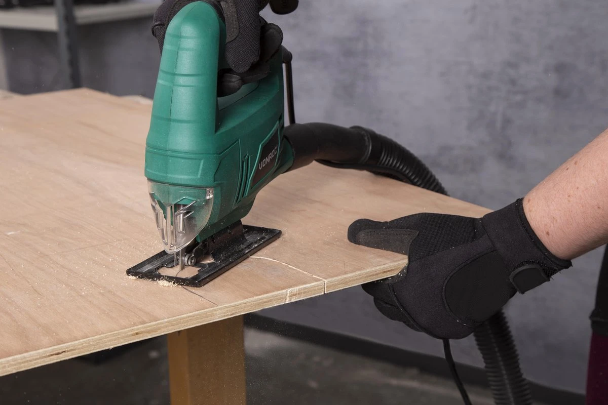 - Sluit de decoupeerzaag aan op een stofzuiger om het stof op te vangen. Zo behoud je een vrij zicht op de zaaglijn, werk je in een schone omgeving en adem je zelf geen zaagstof in.