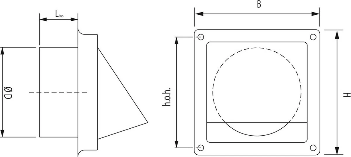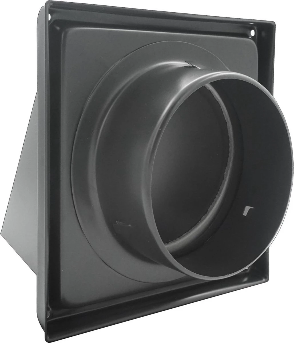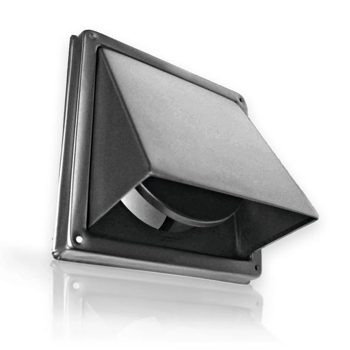 Een fraai design gevelrooster met een schuine kap voor luchtafvoer (gevelklep). Gemaakt van roestvast staal van zwaardere kwaliteit met een klep die bij het uitblazen van lucht open gaat en het gat mooi afsluit wanneer er geen luchtverplaatsing is (geïsoleerd voor geluidreductie). Voor montage aan gevel/buitenmuur voor het afvoeren van lucht naar buiten. Aan de achterkant is dit rooster voorzien van een aansluitbus dat past in een buis met diameter 125mm.