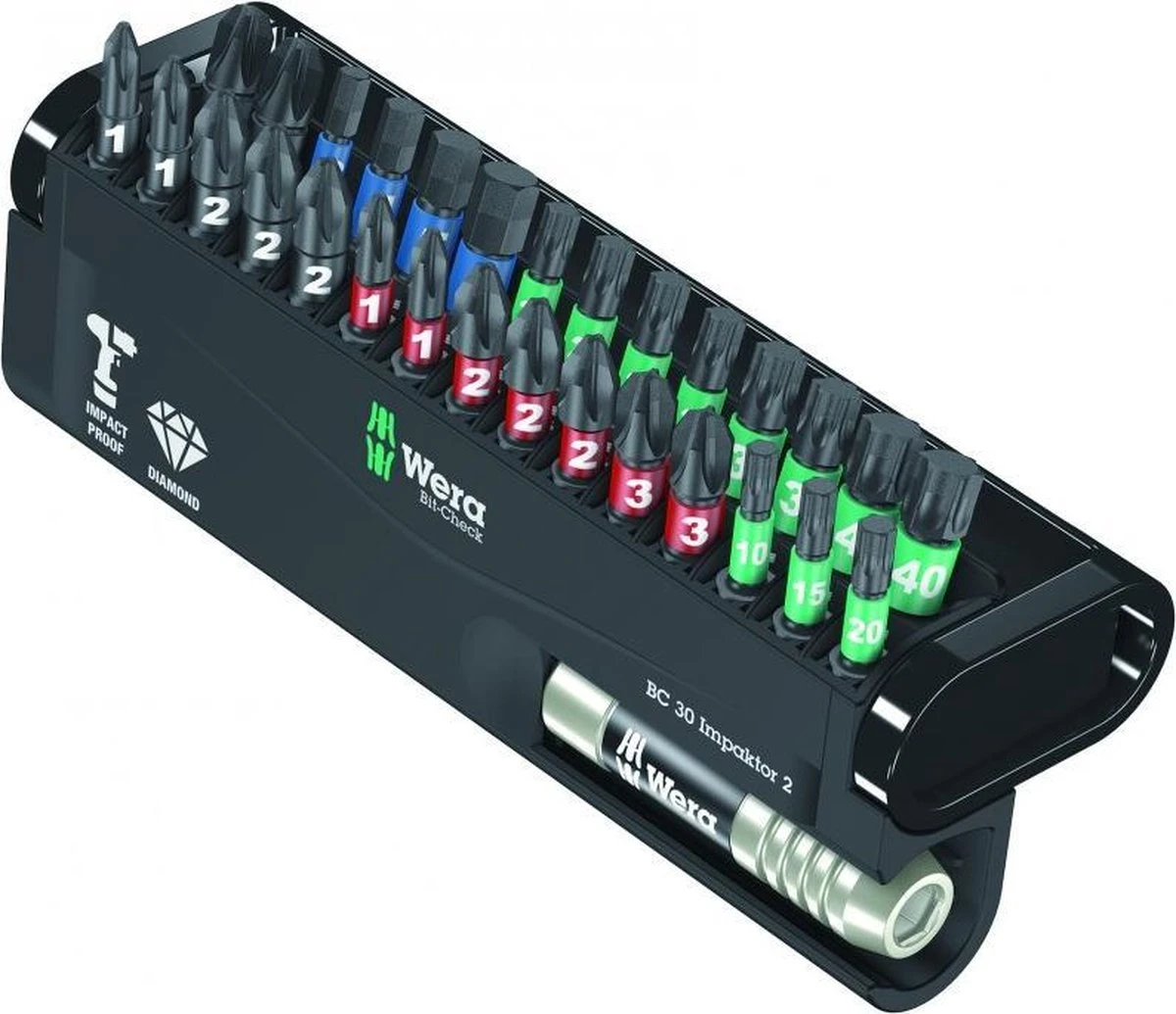 Impaktor houder met spanring en ringmagneet. 29 Impaktor bits. Door een mix van de best mogelijke materiaaleigenschappen en door optimaal, voor extreem gebruik, aangepaste geometrieën bereiken de Wera Impaktor gereedschappen uitzonderlijke standtijden. Bijzonder geschikt voor (Impact) handschroefmachines. De houder met interne magneet houdt extra lange en zware schroeven stevig vast. Ideaal voor het werken boven het hoofd. De kleine stukjes diamant, die op de punt van de bit zijn opgebracht, bijten zich in de schroef vast en zorgen voor een superieure grip en voorkomen het uitglijden uit de schroefkop.