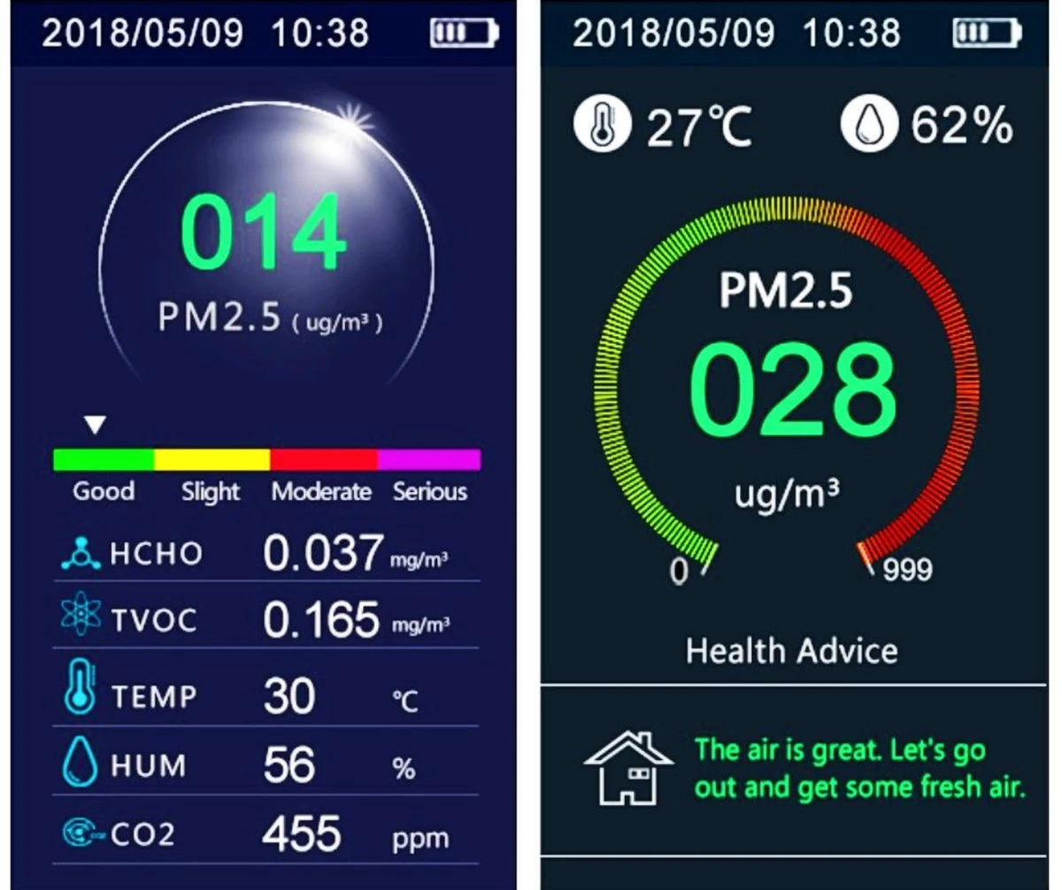 Met deze Luchtkwaliteit meter van WesGoodz kan je gemakkelijk de kwaliteit van de lucht in een bepaalde ruimte meten. Met het handige display is het mogelijk om in een oogopslag zien wat het co2 gehalte is, de tempratuur, de datum, het batterijgehalte, de tijd, de vochtigheid, het TVOC-gehalte en de hoeveelheid van HCHO in de lucht. Ook geeft het apparaat meteen aan of de luchtkwaliteit goed, redelijk, matig of slecht is. Ook kan je door de knoppen op de achterkant eenvoudig switchen naar de andere metingen en duidelijke grafieken. Op de grafieken kan je makkelijk aflezen van verloop van tijd om te zien of de lucht beter of slechter wordt.
