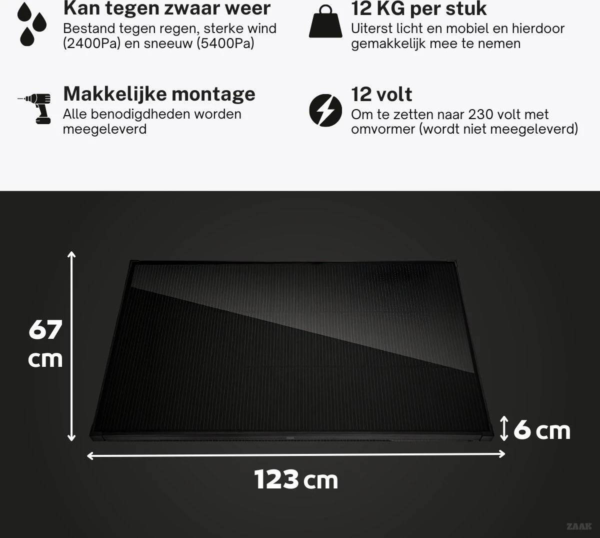Plug and Play 340 Watt zonnepaneelsysteem voor alle 12 Volt toepassingen, zoals: caravans, campers, boten, huis, tuin, schuur of boerderij. Eenvoudige en snelle montage dankzij de voorgeboorde gaten aan de achterkant van de panelen. Monokristallijn zonnecellen hebben een zeer hoog rendement. Het paneel is robuust, waterdicht, stabiel en zit in een aluminium frame. Dit zorgt ervoor dat het zonnepaneel bij alle weersomstandigheden kan worden gebruikt. Naast de zonnepanelen wordt er een laadregelaar meegeleverd, deze maakt het mogelijk om de stroom die opgewekt wordt direct in een accu te stoppen. Op de laadregelaar zit teven eens USB-uitgang waarmee direct apparaten kunnen worden opgeladen. De set kan eenvoudig op een accu worden aangesloten dankzij de meegeleverde bekabeling. Er worden twee panelen geleverd en ieder heeft een afmeting van 123 x 67 cm en een gewicht van 12 kilogram.